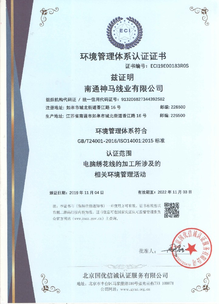 环境认证证书英文版2019